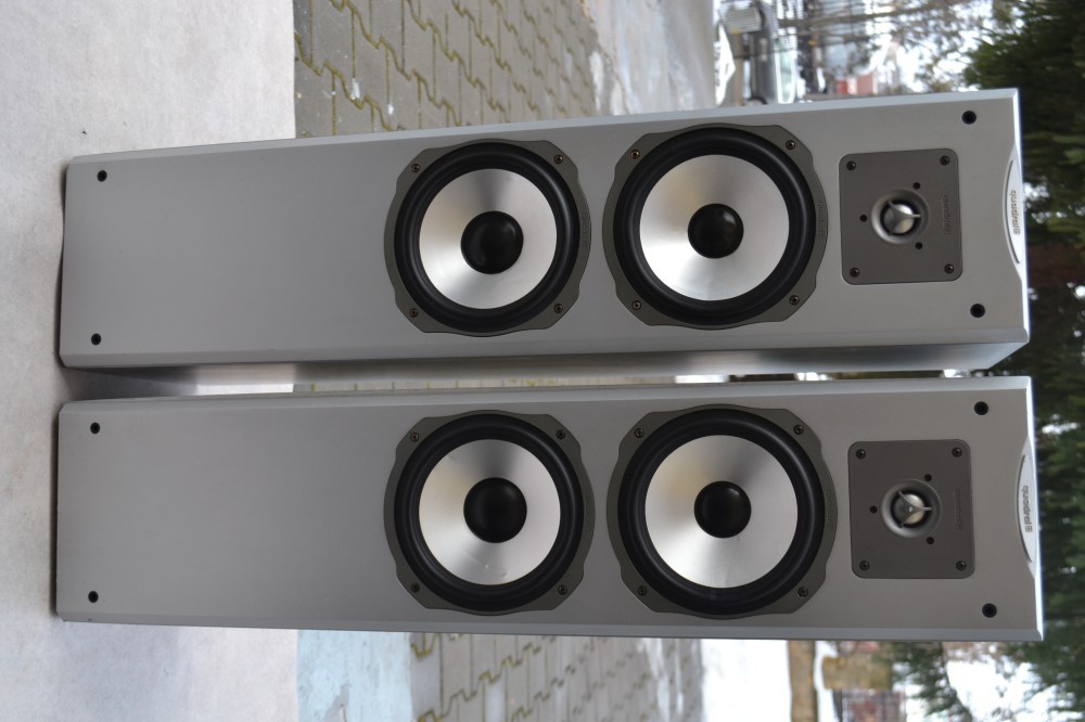 Boxe Quadral Platinum 620: 3 cai, bass reflex, tip coloana, culoare argintie, 2x18 cm, bass supensii cauciuc, 4-8 ohmi, 120/180W, 30-24 000 Hz, made in Germany, nu detin plase de protectie, mufe aurite, H 88, L 21, A 27 cm, difuzoare aluminiu, poze reale.