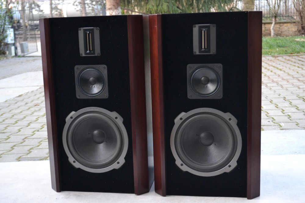Boxe Quadral Wotan HiEnd : pe 3 cai, bass tip reflex, diametru bass de 25 cm, suspensii bass schimbate cu suspensii originale, cutii lemn, mahon, plase de protectie, inalte ribbon, impdanta 8 ohmi, 150W/200W, frecventa de raspuns 30Hz-50000Hz, made in West Germany, siguranta pentru inalte, serii consecutive, foarte grele, dimensiuni H=70cm, L=41cm, A=36cm, poze reale.