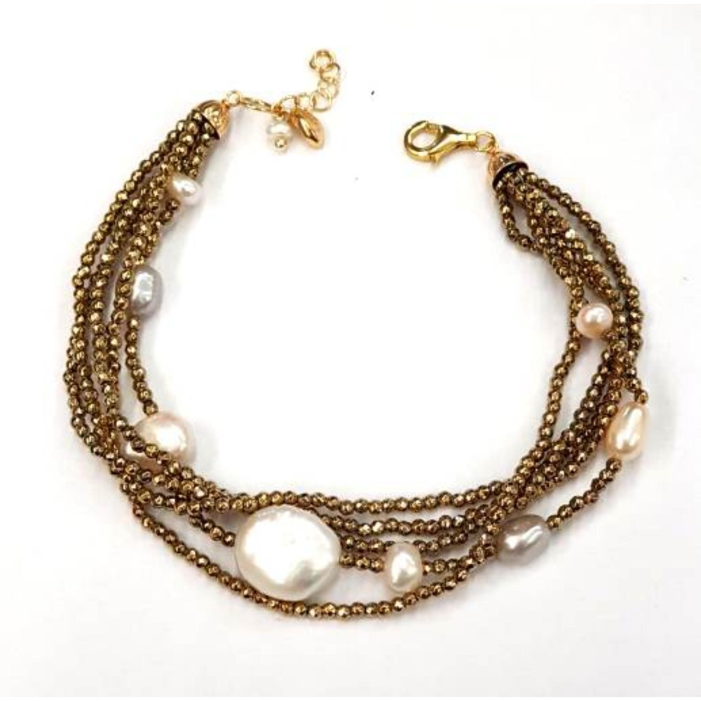 Brățară Celeste din hematit auriu și perle. Brățară cu cinci șiraguri din hematit auriu natural și perle de cultură. Dimensiune: aproximativ 19 - 23 cm, reglabilă. Se poate compune set cu: Colier Celeste. Detalii produs: Argint 925/°°° placat cu aur galben, cu tratament antioxidant unic. Certificat de garanție a materialului. Cutie și pungă cadou incluse. Fiecare bijuterie este realizată manual, cu precizia inconfundabilă Made in Italy. Notă: Pot exista mici diferențe față de imaginea produsului, deoarece fiecare bijuterie este realizată manual, iar perlele sunt neuniforme. Culorile pietrelor semiprețioase pot diferi în funcție de reflexia luminii.