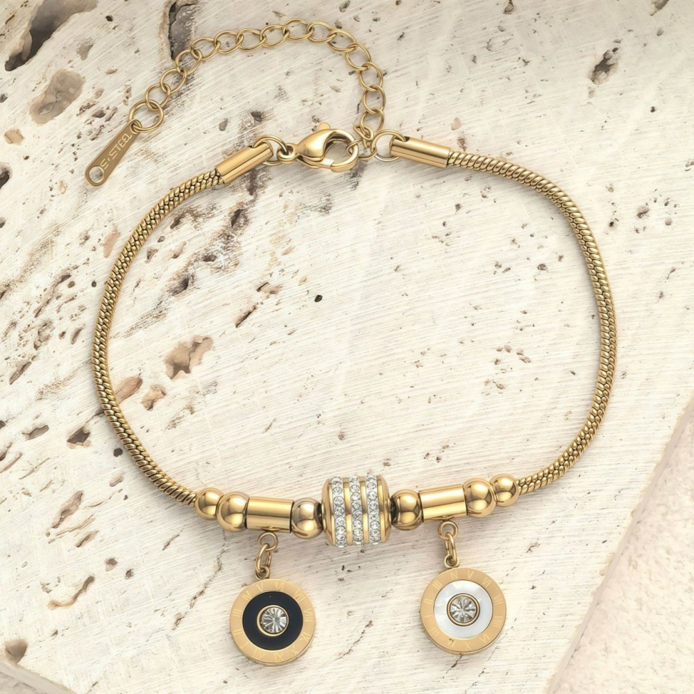 Brățară elegantă din oțel inoxidabil, placată cu aur de 18K, decorată cu două pandantive rotunde – unul cu rășină neagră și altul alb, ambele încrustate cu cristale fine tip zirconiu. Sistemul de prindere reglabil permite ajustarea ușoară pe orice încheietură, oferind un plus de confort și rafinament. Un accesoriu modern, potrivit atât pentru ținutele de zi cu zi, cât și pentru ocazii speciale. Nu oxidează și nu își schimbă culoarea, fiind ideală pentru un cadou de durată.