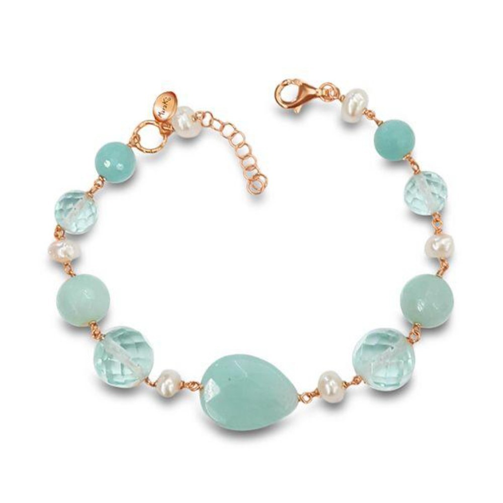 Brățară Style din amazonit, cuarț și perle. Brățară din amazonit, cuarț albastru celest și perle de cultură. Lungime: 18 - 23 cm, reglabilă. Se poate compune set cu: Colier Style și cercei Style. Detalii produs: Argint 925/°°° placat cu aur roz, cu tratament antioxidativ unic. Certificat de garanție a materialului. Cutie și pungă cadou incluse. Fiecare bijuterie este lucrată manual, cu precizia inconfundabilă Made in Italy. Notă: Culorile pietrelor semiprețioase pot diferi în funcție de reflexia luminii.