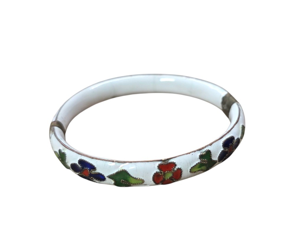 Brățar vintage cloisonne, lucrat manual cu bază metalică și finisaj emailat. Decor floral policrom pe fond alb, realizat prin tehnica cloisonne, fire metalice subțiri care delimitează emailul colorat. Sistem de închidere tip balama.