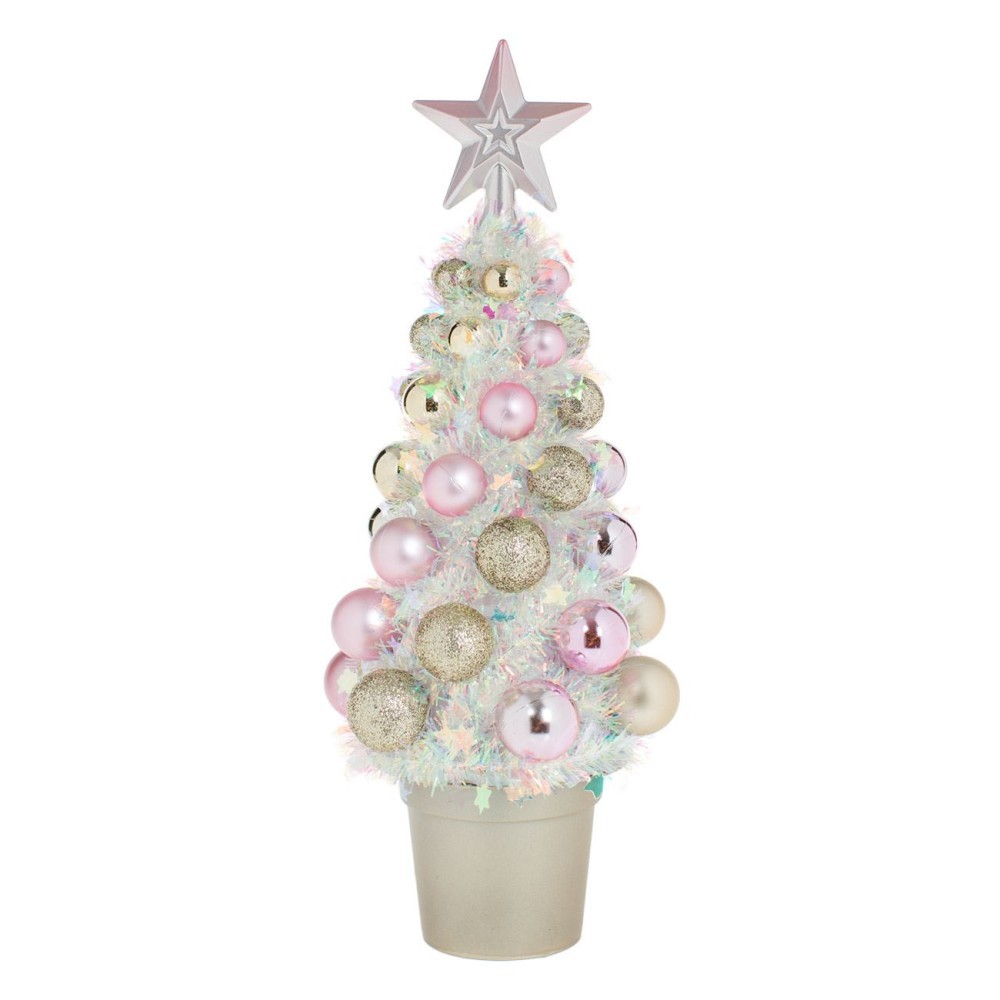 Brad Decorativ de Craciun, Irizat, Tinsel, Globuri Auriu Roz, Inaltime 30cm
