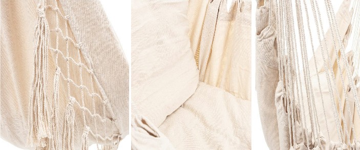 Cadrul scaunului hamac include un cadru din lemn care îi permite să își păstreze forma chiar și atunci când este așezat. Hamacul se adaptează perfect la forma corpului, ceea ce are un impact semnificativ asupra calității relaxării. Ușor de depozitat - atunci când este pliat, ocupă puțin spațiu. Scaunul hamac Brasil vă permite să vă relaxați în timp ce vă legănați. Stilul boem distinctiv se potrivește perfect în multe interioare. Hamacul adaugă caracter oricărei grădini. Hamacul este perfect atât în grădină, pe terasă, cât și în interior.