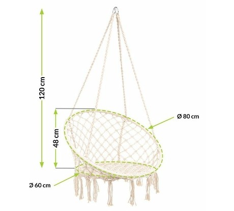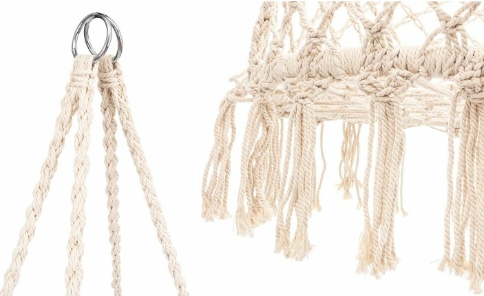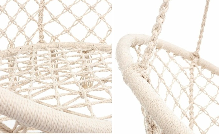 Fotoliul suspendat are 4 frânghii împletite puternice care îl fac durabil. Datorită materialelor utilizate, acesta are o durată de viață mai lungă. Datorită dimensiunii sale mari, un adult poate utiliza cu ușurință produsul. Un avantaj deosebit al scaunului este spătarul înalt, care crește semnificativ confortul de ședere.