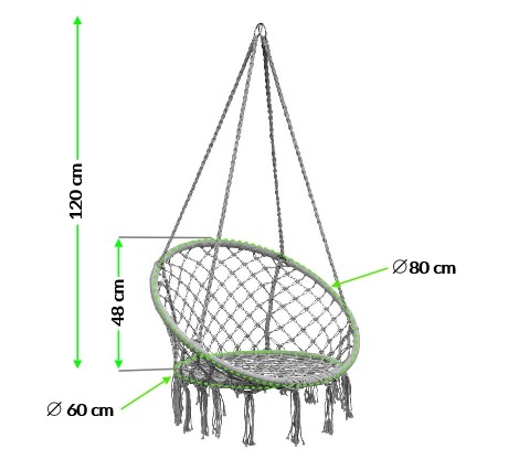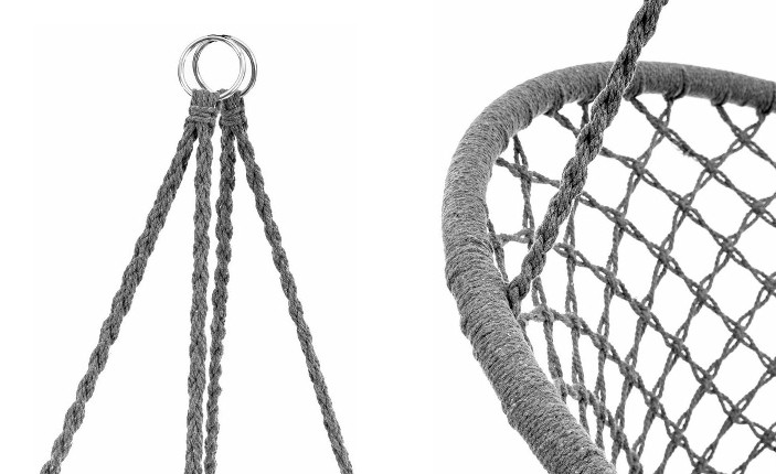 Fotoliul suspendat are 4 frânghii împletite puternice care îl fac durabil. Datorită materialelor utilizate, acesta va dura mai mult. Datorită dimensiunii sale mari, un adult poate utiliza cu ușurință produsul. Un avantaj deosebit al scaunului este spătarul înalt, care crește semnificativ confortul de ședere.