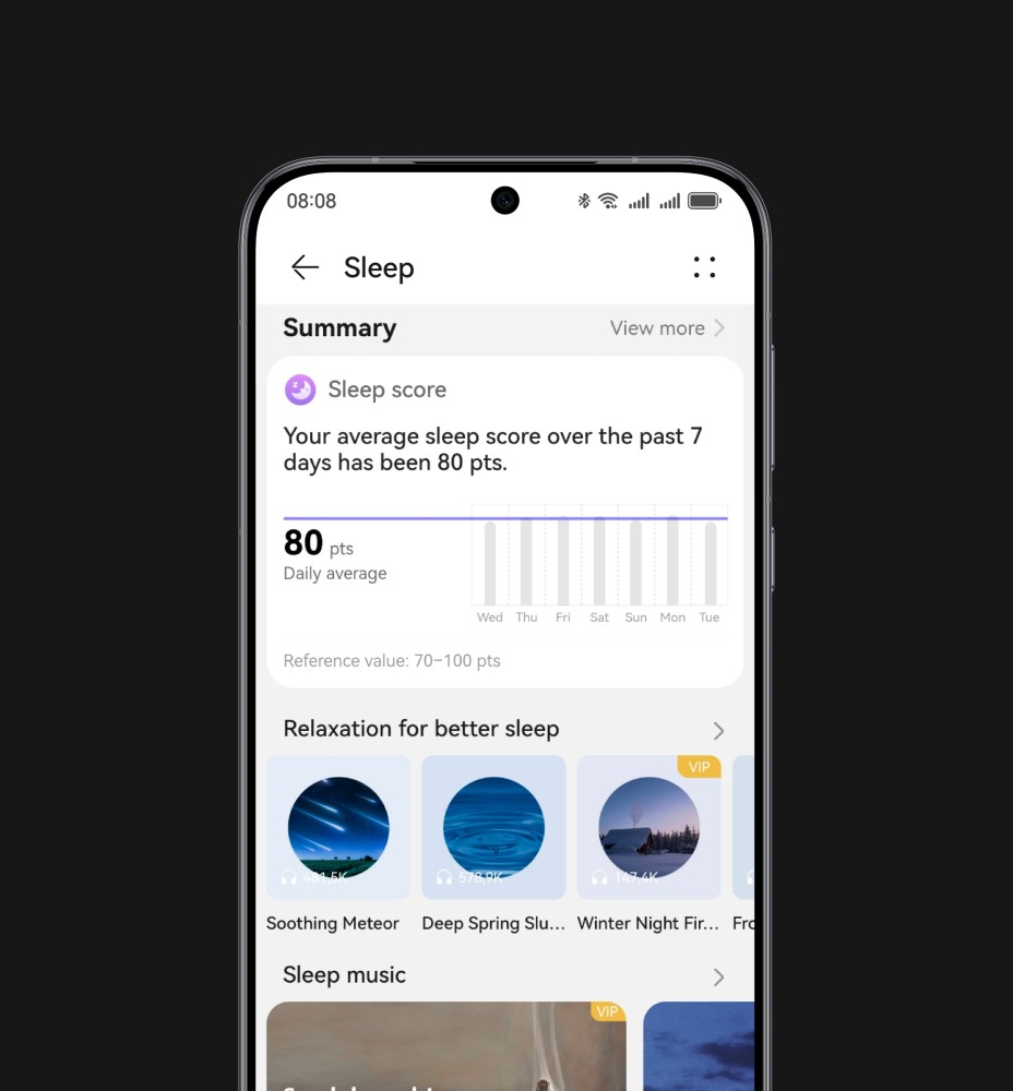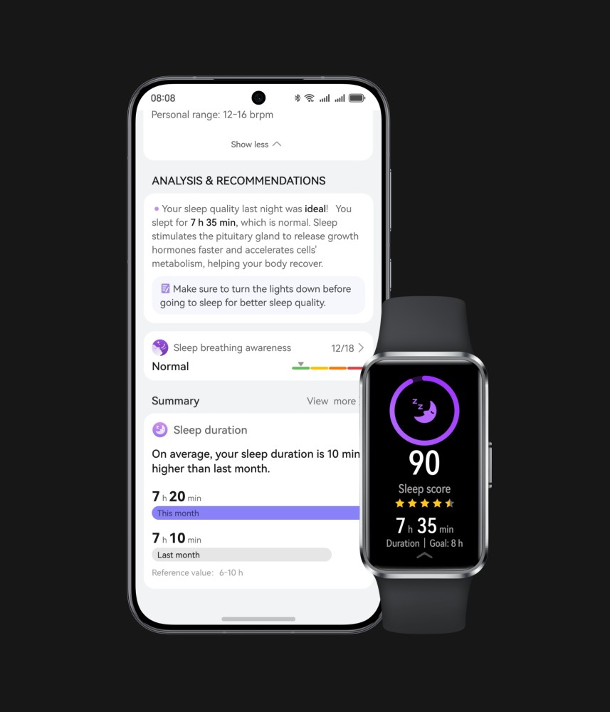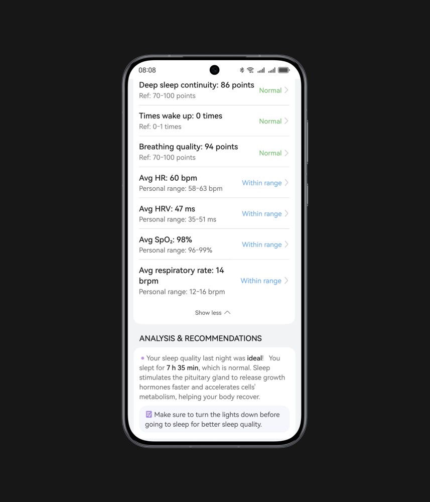 Ascultati ce va spune corpul dvs. prin intermediul datelor fiziologice, cu informatii de nivel inalt si analiza a tendintelor privind durata somnului, ratingul calitatii, raportul de somn profund si multe altele, pentru a vedea imediat daca acele sfaturi personalizate sunt eficiente. |