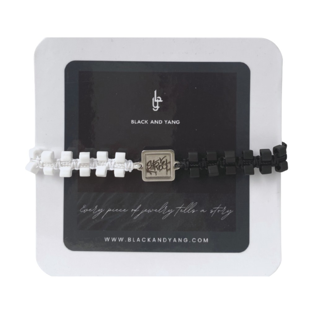 - Realizata din margele din ceramica japoneza si charm din otel inoxidabil argintiu inscriptionat Street, pe snur negru