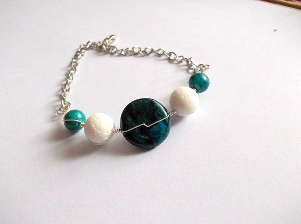 Bratara criocolla verde si coral alb, bijuterie cadou 36834. Bratara coral alb si criocolla (pietre semipretioase). Bratara este reglabila si este realizata si cu sarma argintata.