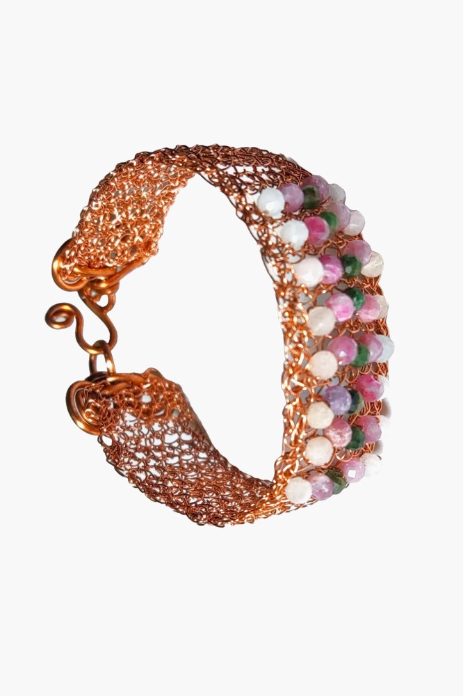 Bratara crosetata cu fir de cupru Morganit Aventurin Turmalina, Multicolor, 17cm