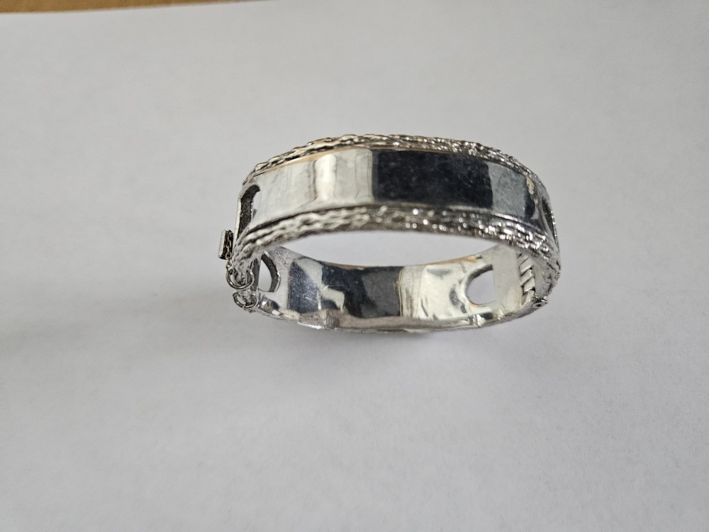 Bratara fixa din argint, latime 1.8 cm, diametru 6 cm x 5.4 cm, marcaj argint, greutate 42.11 gr, in stare buna, cumparati cu incredere, orice produs se poate returna, transport doar prin posta.