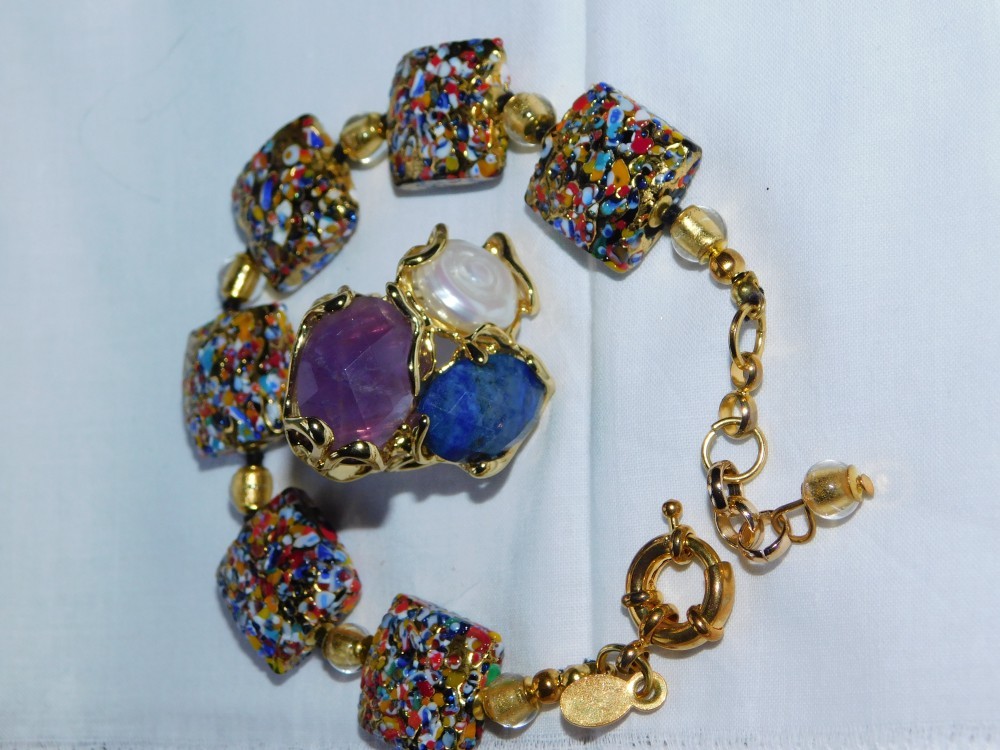 Bratara noua sticla Murano, model 2024, originala, deosebita , sticla masiva, inchidere sigura , extensie pina la 25 cm, masiva , cadou inel placat , lapislazuli, ametist si perla , reblabil , mare , superb