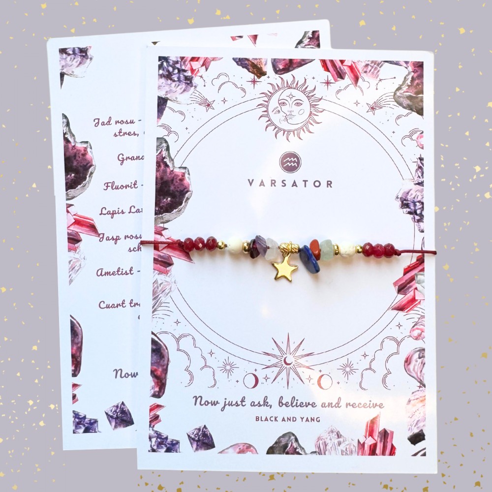 - Realizata cu 7 cristale naturale chips benefice pentru Zodia Varsator - jad grena, granat, fluorit, lapis lazuli, jasp rosu, ametist, cuart transparent