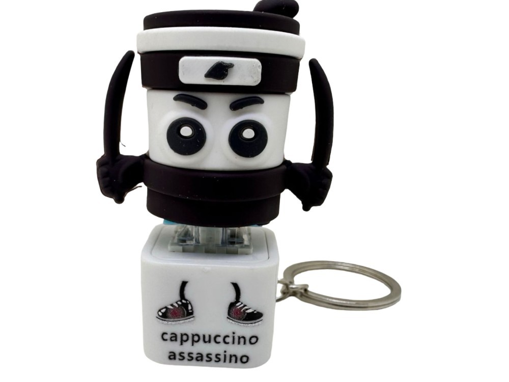 Adauga o doza de umor si energie zilei tale cu acest breloc haios în forma de pahar de cappuccino ninja – Cappuccino Assassino! Apasa pe baza si brelocul emite sunete originale amuzante, perfecte pentru a-ti inveseli prietenii sau colegii. Dimensiuni aproximative: 7 x 3.5 cmMaterial: PVC cauciucat + elemente electroniceSunete: originale, activate prin apasareAccesoriu: inel metalic pentru cheiRecomandat: 6+ ani Ideal pentru iubitorii de cafea, colectionari sau cadouri funny!