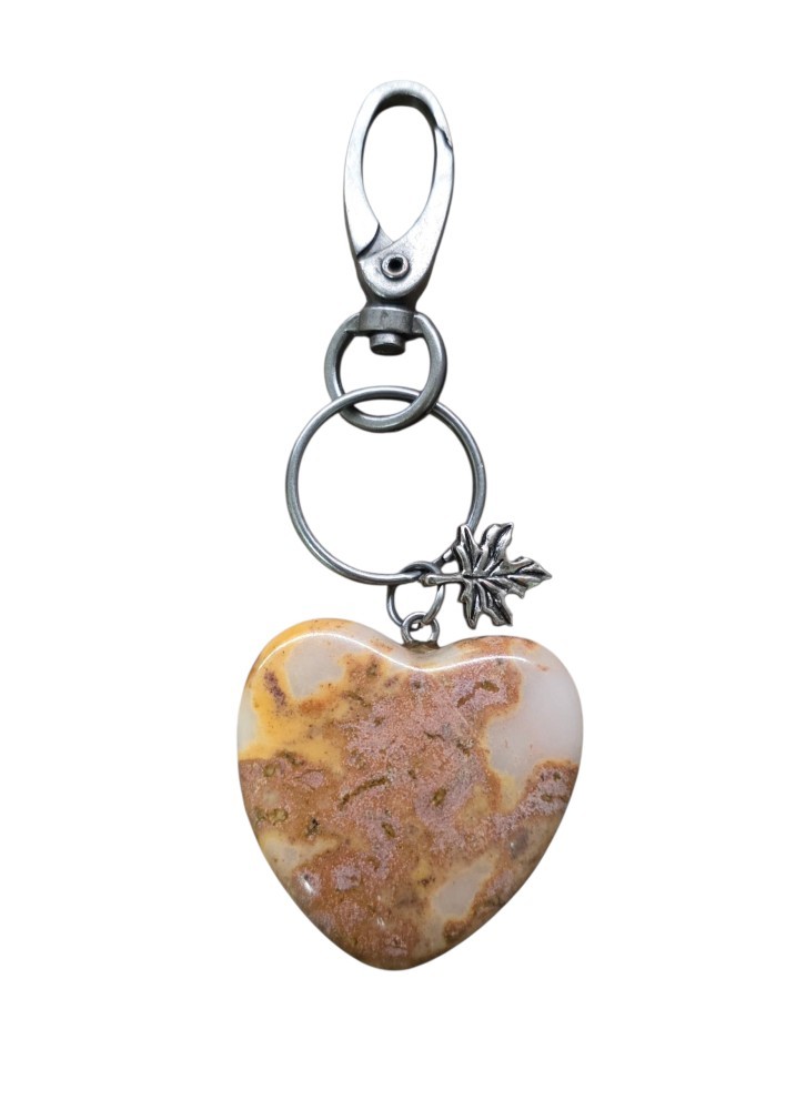 Breloc cu piatră naturală jasp, sculptată și șlefuită sub formă de inimă, cu montură metalică argintie. Elementele metalice sunt compuse din inel dublu de prindere, carabină pivotantă robustă și un mic pandantiv decorativ în formă de frunză.