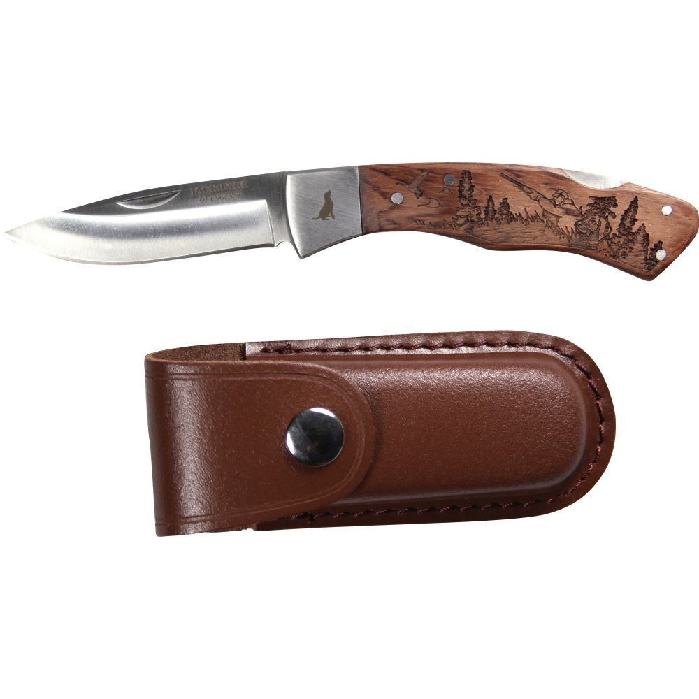 Gama de cuțite Jack Pyke Shires include cuțite cu lamă din oțel inoxidabil, cu mânere din lemn de trandafir, cu diferite motive gravate cu laser pe suport, vânător, pește, fazan și căprioară. Fiecare cuțit vine cu o teacă din piele maro, cu închidere prin apăsare.