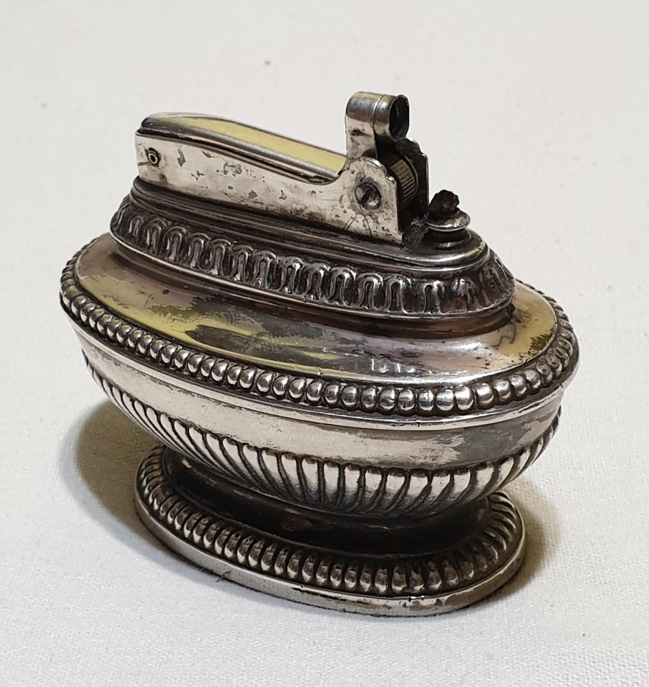 Piesa absolut superba, metal masiv argintat, in stare foarte buna, daca se insista inca mai scapara, desigur trebuie alimentata cu gaz, eventual schimbata piatra, cu siguranta va functiona. Dimensiune 8 cm lungime, aprox 6.5 inaltime si 5 cm latime. Pe spate se regasesc stantate seria, marca, tara de fabricatie ( Anglia). O piesa veche de colectie, de expus/ ornat vitrina, un cadou inedit, recomand cu placere