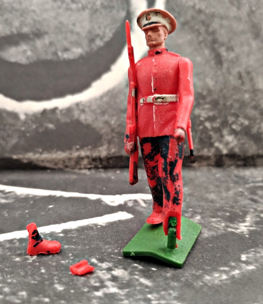 Britains LTD 1/32 54 mm infanterist plastic rosu vopsea originala Cap si brate mobile. Picior spart la nivel bocanc necesita inverventie superglue