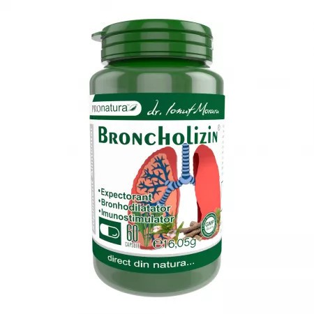 BRONCHOLIZIN 60CPS este un supliment alimentar formulat pentru a susține sănătatea aparatului respirator. Acesta conține ingrediente active din plante recunoscute pentru proprietățile lor benefice în ameliorarea simptomelor respiratorii, precum tusea, iritațiile gâtului și disconfortul cauzat de răceală.