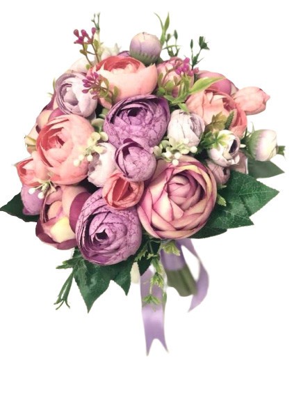 Buchet de flori cadou sau pentru mireasa, nasa si domnisoa de onoare, realizat din bujori de matase si verdeata artificiala, cromatica mov / portocaliu / bej si maner imbracat in panglica mov.