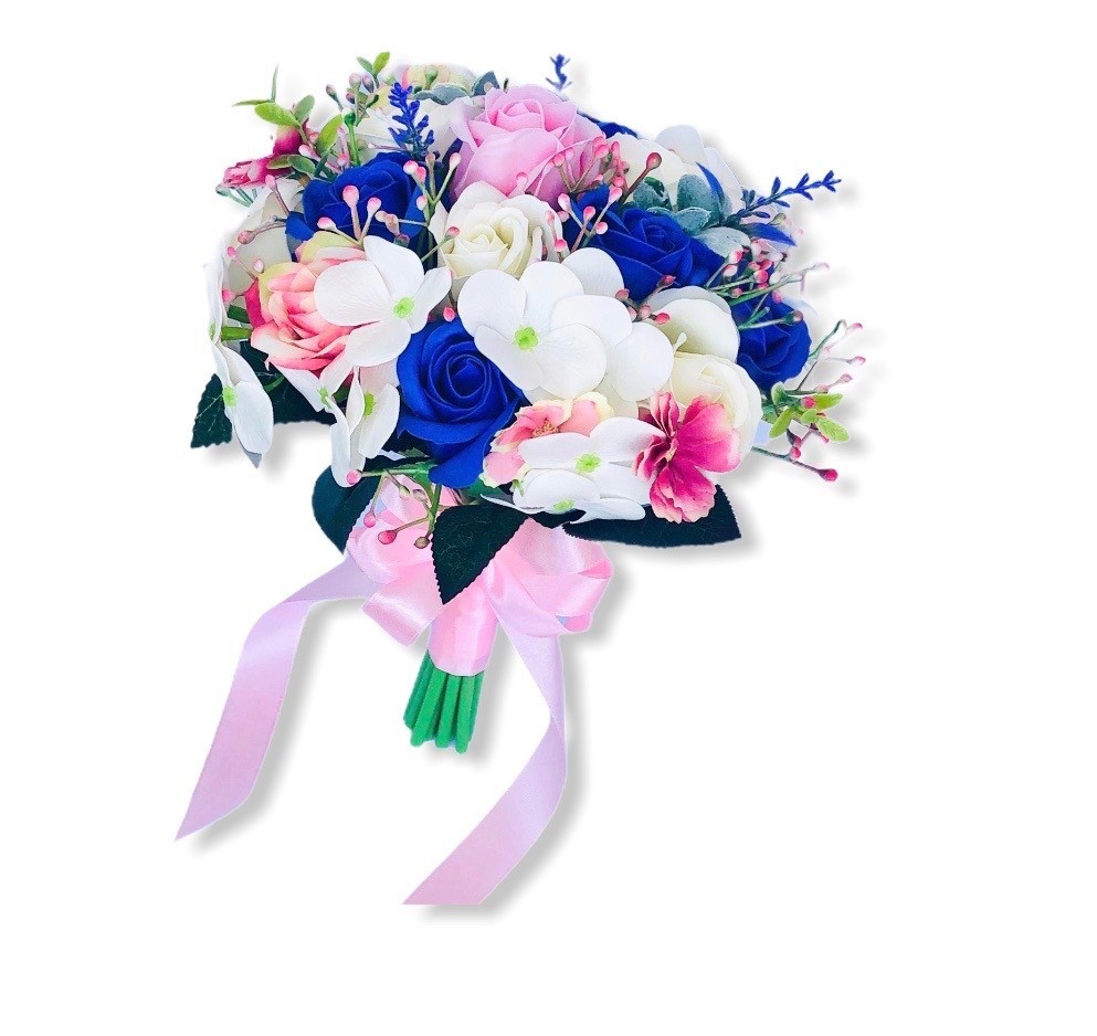 Am ales pentru acest model 21 de flori, trandafiri parfumati din foita de sapun (albi albastriisi roz), hortensii parfumate din foita de sapun (albe), orhidee „real touch” (albe), toate montate pe tulpini din silicon, si frunze de eucalipt „real touch” (culoare verde). Tulpinile sunt imbracate in panglica de culoare roz.