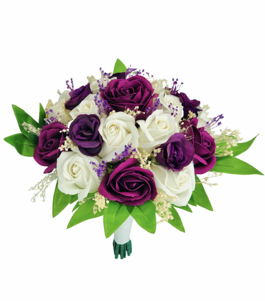 Buchet mediu personalizabil cu trandafiri si floarea miresei (Violet, Alb)