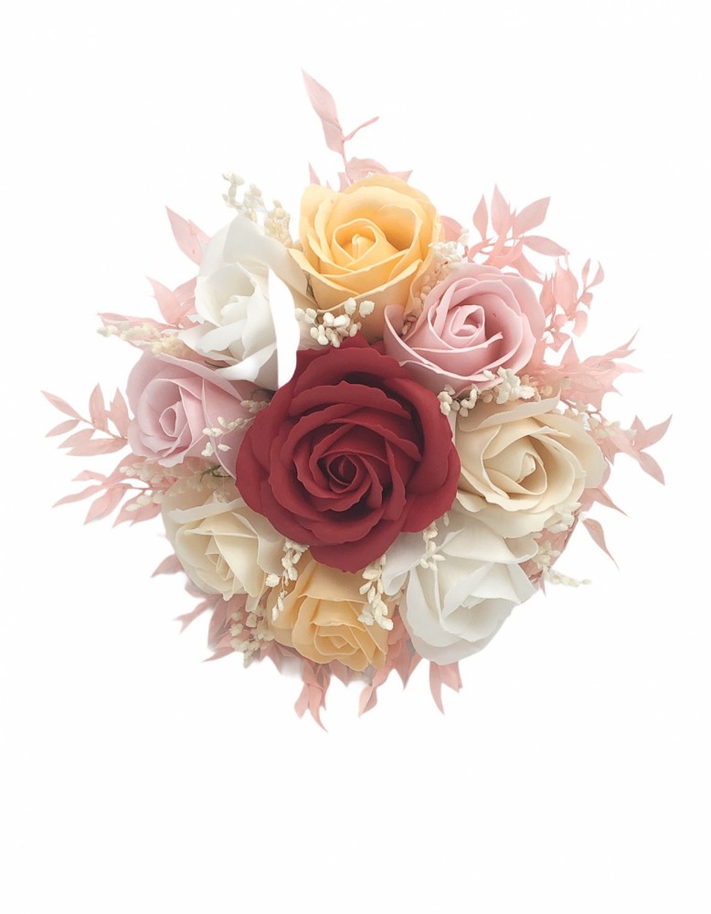 Acesta se realizeaza cu noua trandafiri din foita parfumata de sapun si plante naturale uscate dupa cum urmeaza: in centru un trandafir mare (6 cm), in jurul acestuia opt trandafiri mici (4 cm) si intre ei se monteaza plante naturale uscate. Inchiderea se face cu frunze criogenate de ruscus si cotorul se imbraca cu panglica si se decoreaza cu o fundita. Totul in culorile alese de client.