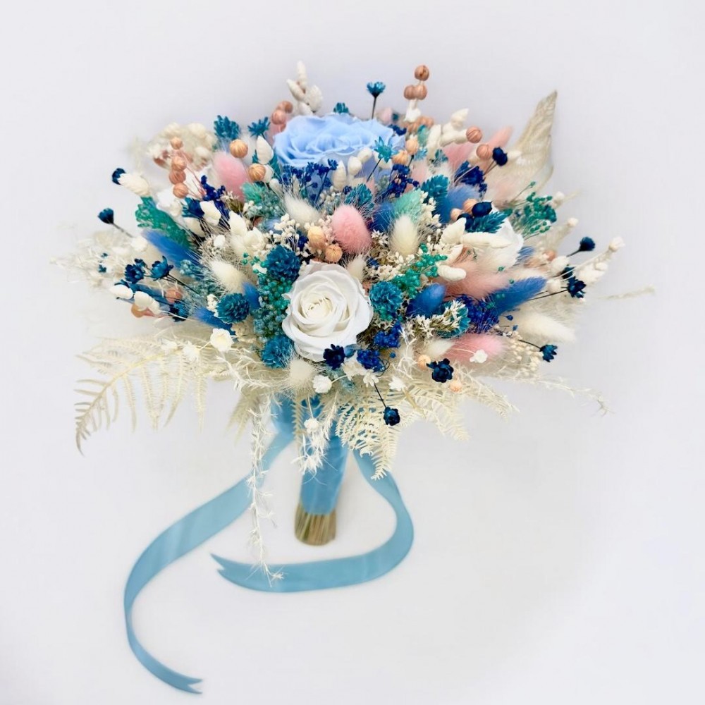 Buchet personalizabil cu trandafirI criogenatI si flori naturale uscate predominant blue