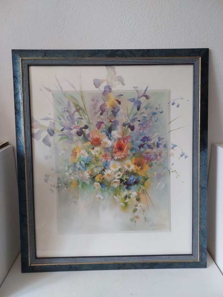 Aceasta lucrare este o reproducere decorativa, semnata tipografic si insotita de prezentarea standard a artistului. Willem Haenraets (n. 1940) este un pictor olandez cunoscut pentru stilul sau romantic si pastelat, foarte apreciat in decoratiuni interioare in anii ’80-’90. Lucrarea infatiseaza un buchet luxuriant de flori de camp in nuante pastelate, redat intr-o maniera delicata si vaporosa, specifica stilului lui Willem Haenraets.