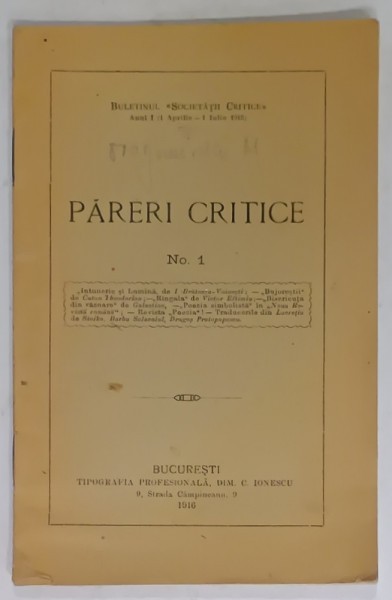 BULETINUL SOCIETATII CRTICE , ANUL I , PARERI CRITICE , No. 1 , 1916