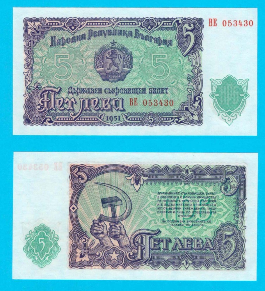 Bulgaria (p#82) 5 Leva 1951 UNC 'RPB' serie: BE 053430 Republica Populară; faţă: Stema, Valoarea; verso: Secera și Ciocanul; material: hârtie; dimensiuni: 125x65 mm;