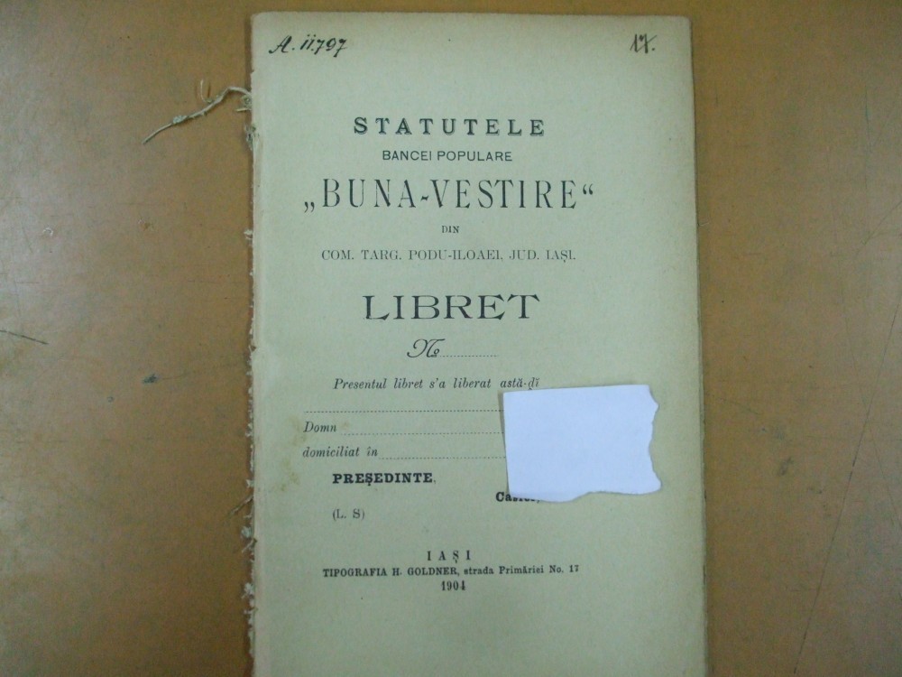 Buna vestire banca populara Podu - Iloaiei Iasi statute Iasi 1904 tip H. Goldner
