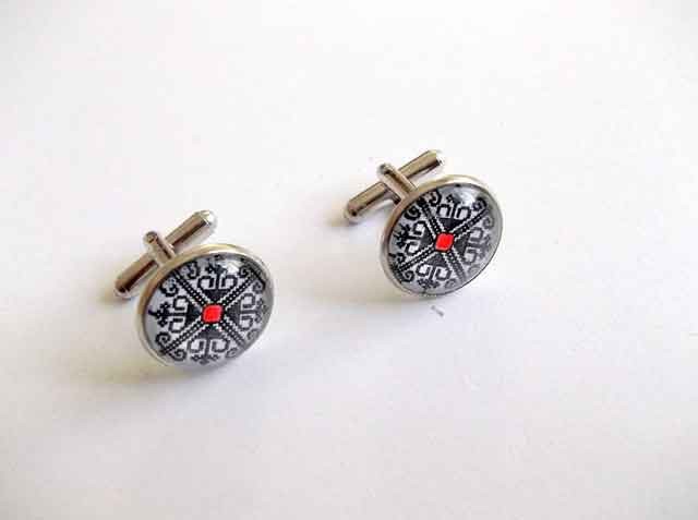 Butoni camasa model traditional ornamental 33329. Articol pentru barbati lucrat manual cu un design de motive traditionale romanesti cu frumoase forme ornamentale negru cu un punct central rosu pe un fundal alb.