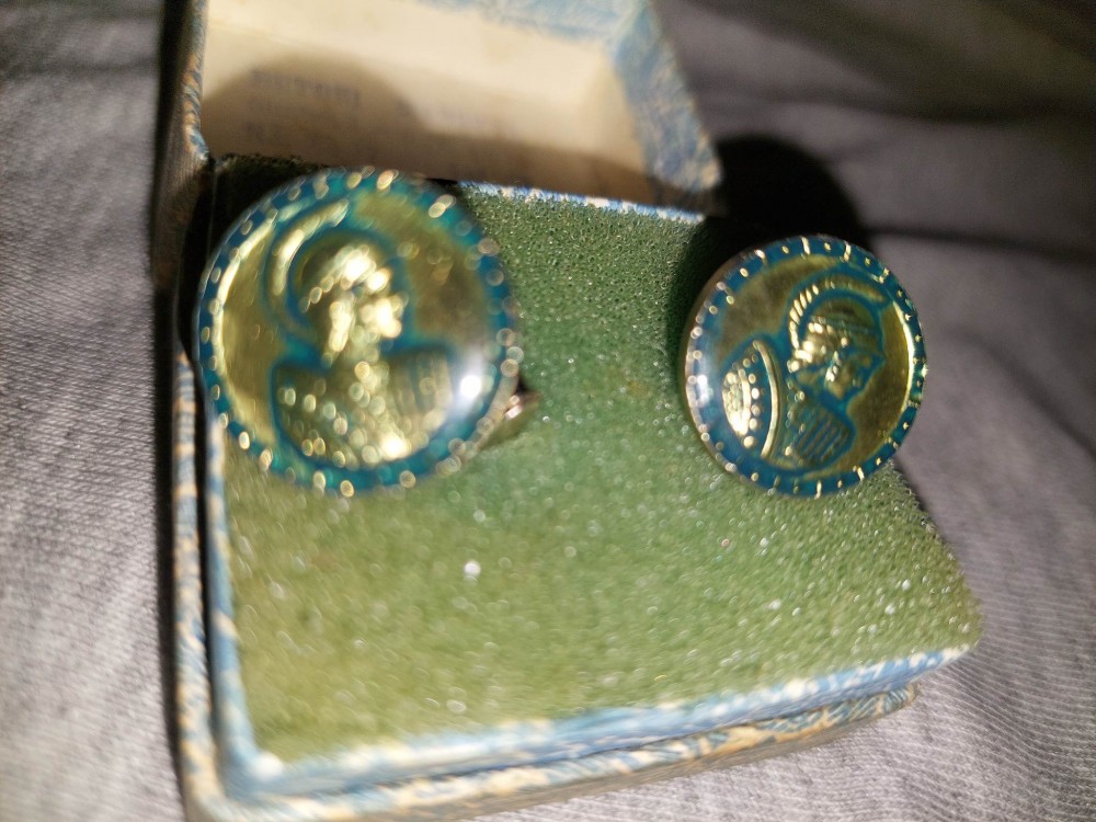 Butoni de manseta vechi in cutie originala,butoni portret Soldat lumea antica
