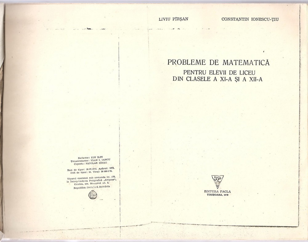 (C3626) PROBLEME DE MATEMATICA PENTRU ELEVII DE LICEU DIN CLASELE A XI- SI A XII-A DE LIVIU PIRSAN SI C-TIN IONESCU-TIU, EDITURA FACLA, 1979
