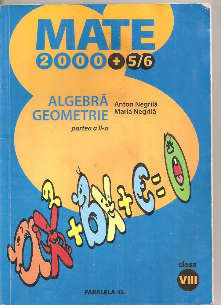 (C3891) MATE 2000+5/6, ALGEBRA, GEOMETRIE, PARTEA A II - A DR ANTON NEGRILA, CLASA A VIII - A, EDITURA PARALELA 45, 2005