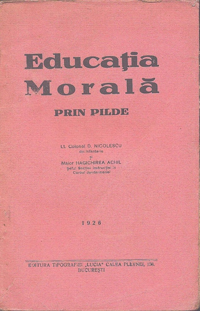 Educația Morală prin pilde de lt-colonel D Nicolescu și maior Hagichirea Achil, 1926, București.