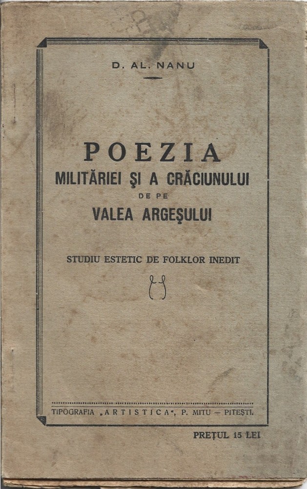 Poezia milităriei și a Crăciunului de pe Valea Argeșului, studiu estetic de folklor inedit de D Al Nanu, 1933, Pitești.