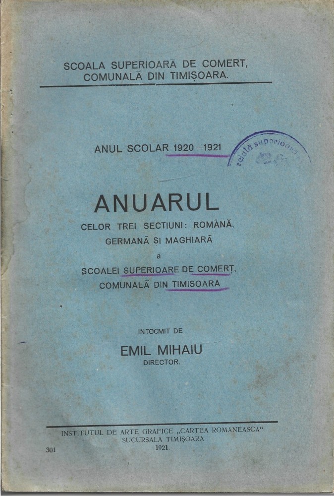 Anuarul celor trei secțiuni: română, germană și maghiară a școalei superioare de comerț, comunală din Timișoara, anul școlar 1920-1921, întocmit de Emil Mihaiu, 1921, Timișoara.