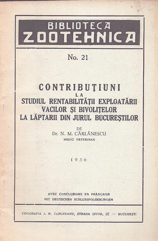C9324N Contribuțiuni la studiul rentabilității exploatării vacilor și bivolițelor la lăptarii din jurul Bucureștilor de dr N M Cârlănescu, 1936