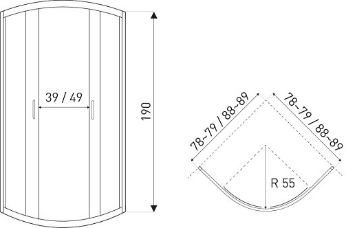 Cabina de duș este echipată cu sticlă securizată de 6 mm . Dimensiunile sale sunt 79x79x190 cm. Sticla cabinei de duș este acoperită cu un strat de protecție KERRA PROTECT pentru o curățare ușoară. Are uși glisante duble. Cabina poate fi echipată cu cădițe de duș standard R 55 (80 x 80 cm).