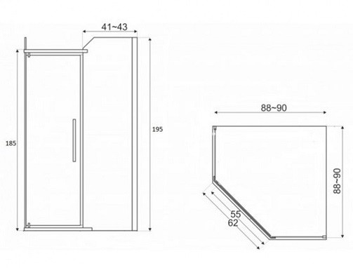 Cabina de duș este echipată cu sticlă securizată din grafit securizat de 6 mm, cu un strat Easy Clean. Cabina de duș este disponibilă într-un design pătrat. Este echipat cu un design al ușii care se deschide. Înălțime totală 195 cm , înălțime față 185 cm , lățime 88-90 cm (2 cm reglabil pe profile). Lățimea ușii este de 62 cm . Lățimea intrării în cabină este de 55 cm . Este echipat cu un suport universal. Pachetul nu include o cădiță de duș.