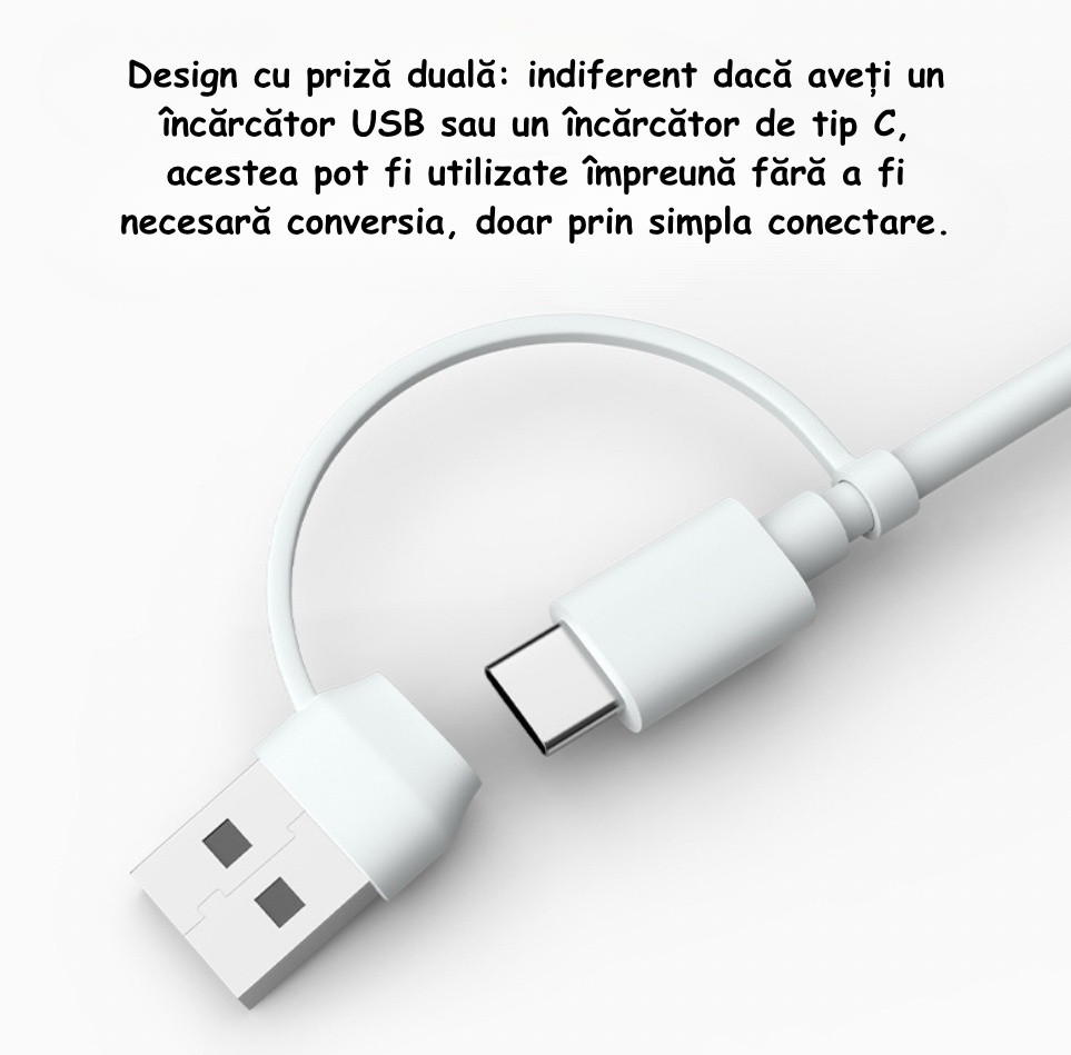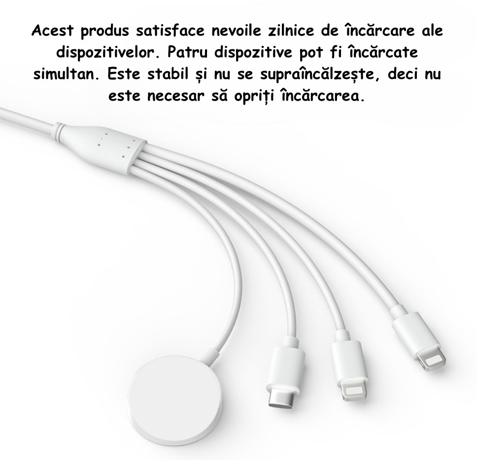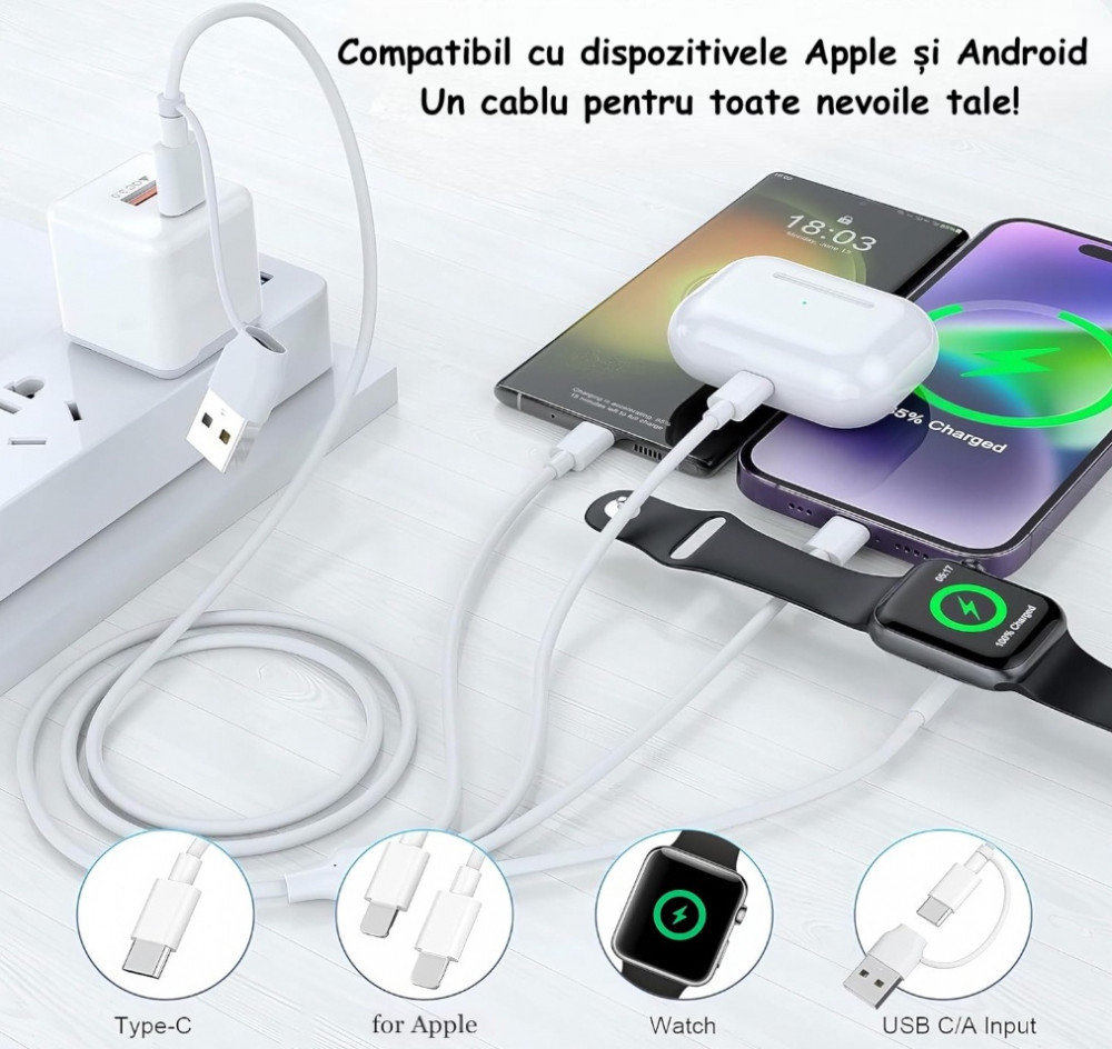 Compatibilitate universala: Acest cablu este compatibil atat cu dispozitivele Apple cat si cu cele Android, inclusiv cele care utilizeaza conectori tip C si micro USB. Astfel, este potrivit pentru o gama larga de produse electronice, de la telefoane si tablete pana la dispozitive smart si alte gadget-uri.