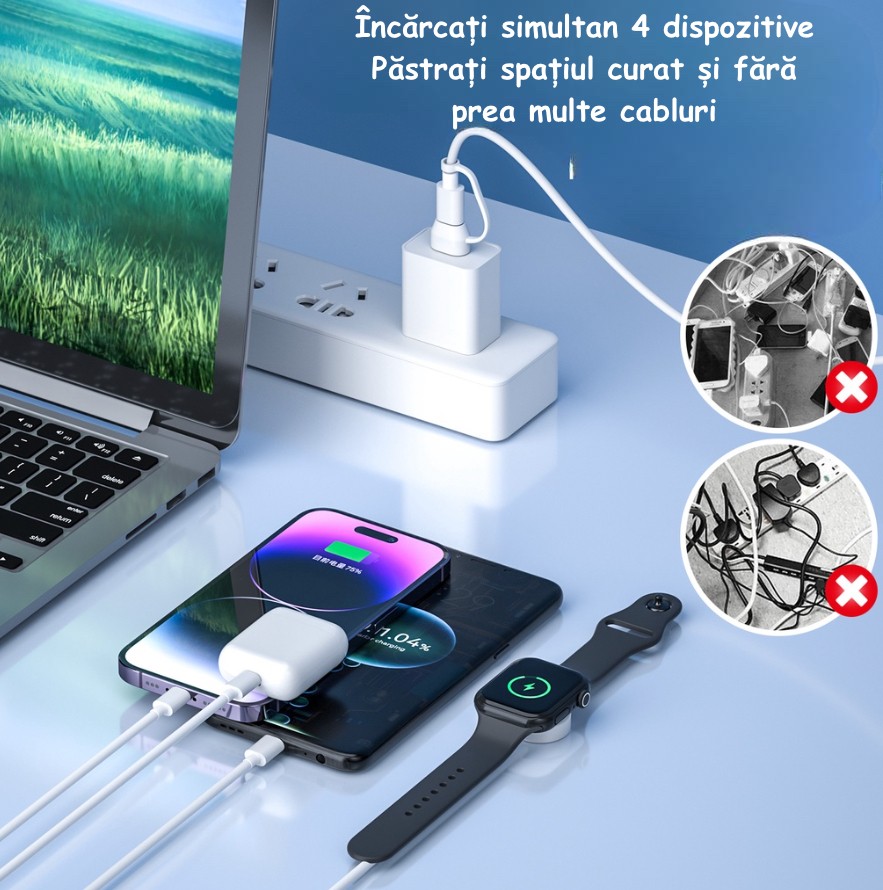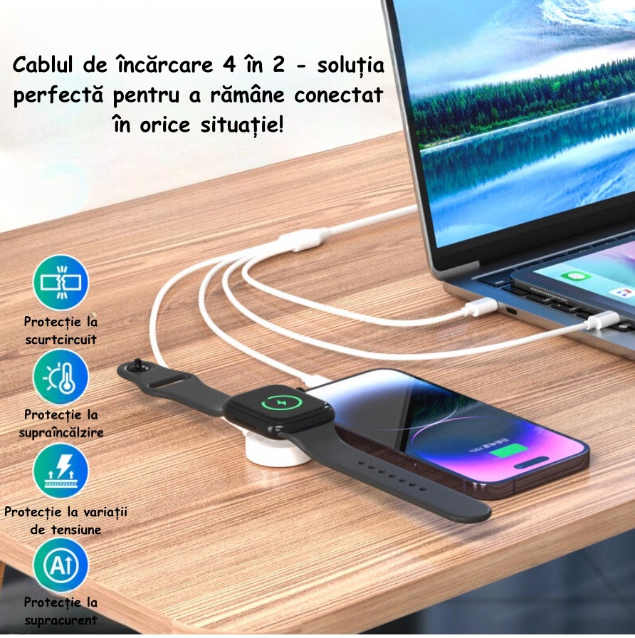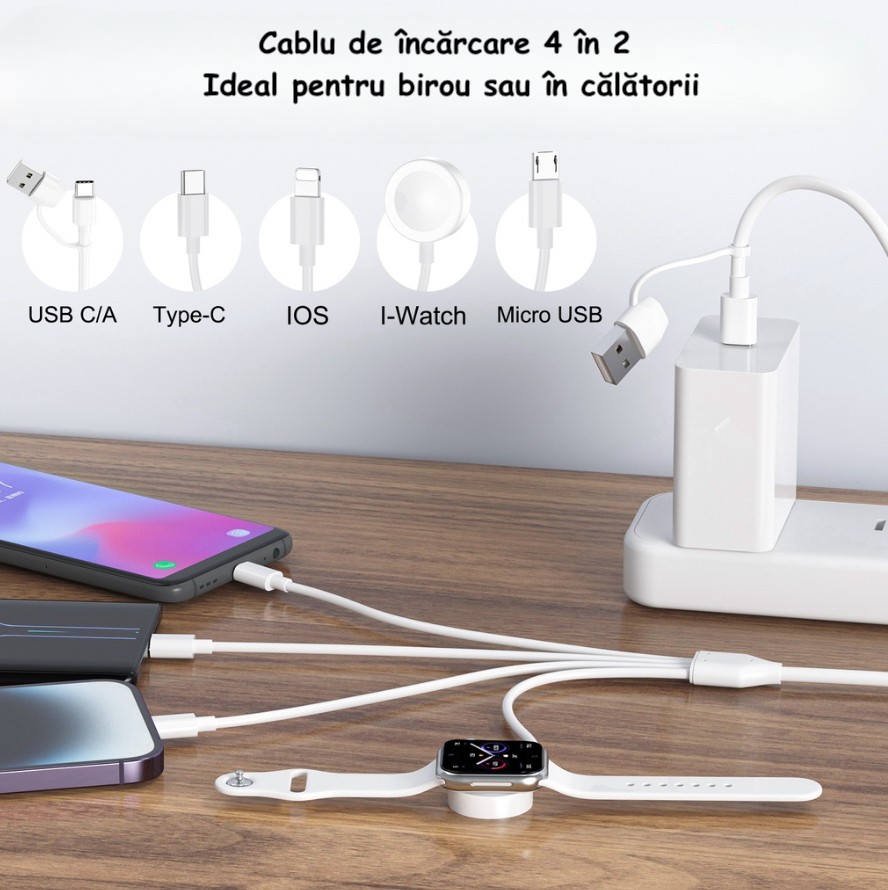 Cablu 4 in 2 ambrasmart este o solutie versatila si eficienta pentru incarcarea si transferul de date intre dispozitive. Cu un design compact si robust, este ideal atat pentru utilizarea de zi cu zi, cat si pentru calatorii.