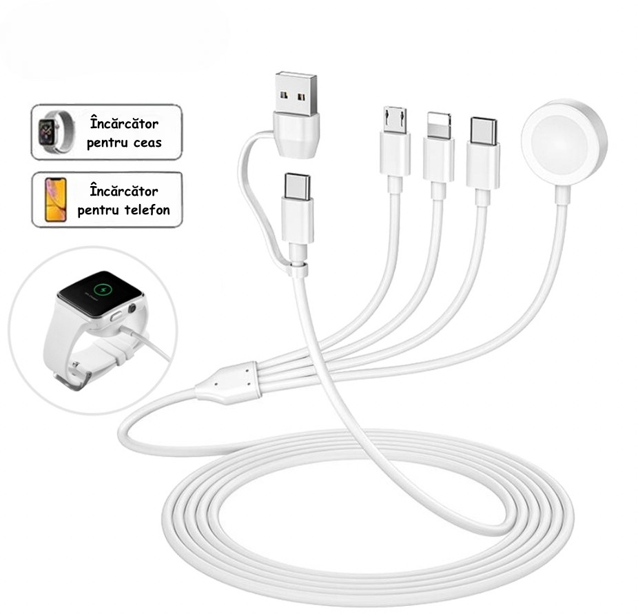 Cablu ambrasmart 4 in 2, Alb, Pentru incarcare si transfer de date, Compatibil Apple si Android, Type C, USB C/A, Micro USB, iOS, i-Watch