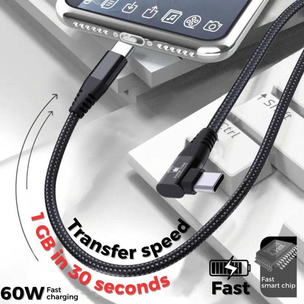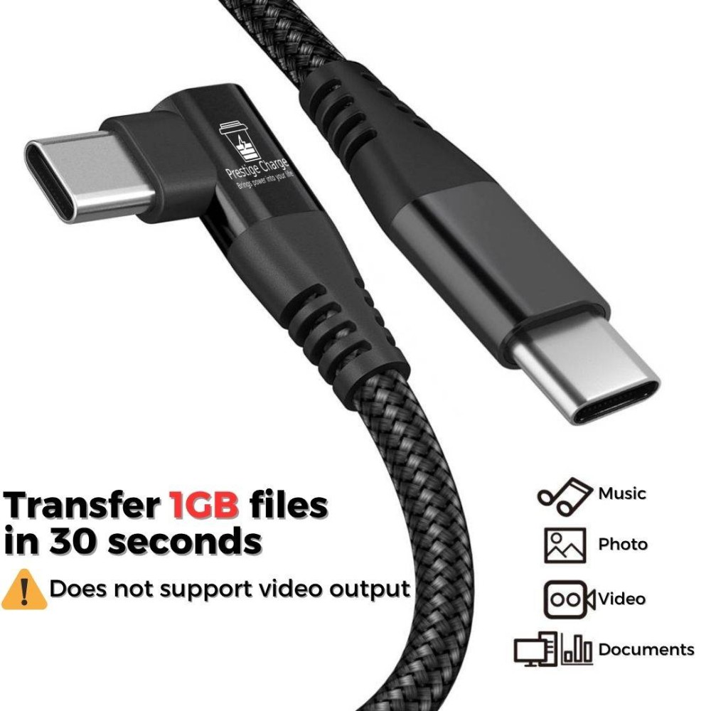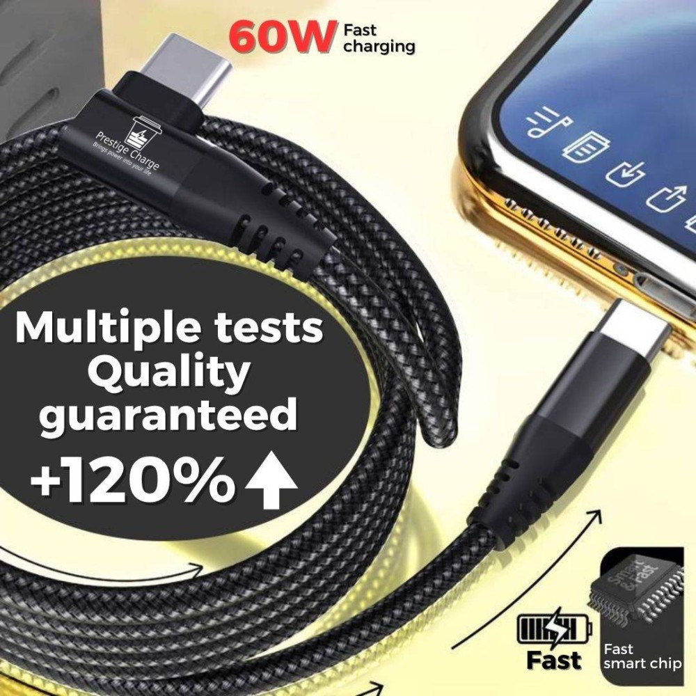 Cablu Date si Incarcare Rapida max 60W, PRESTIGE CHARGE®, TEXTIL PREMIUM, 480 Mbps, Transfer Documente, PD 3.0, Unghi 90 de Grade, USB-C la USB-C, Typ