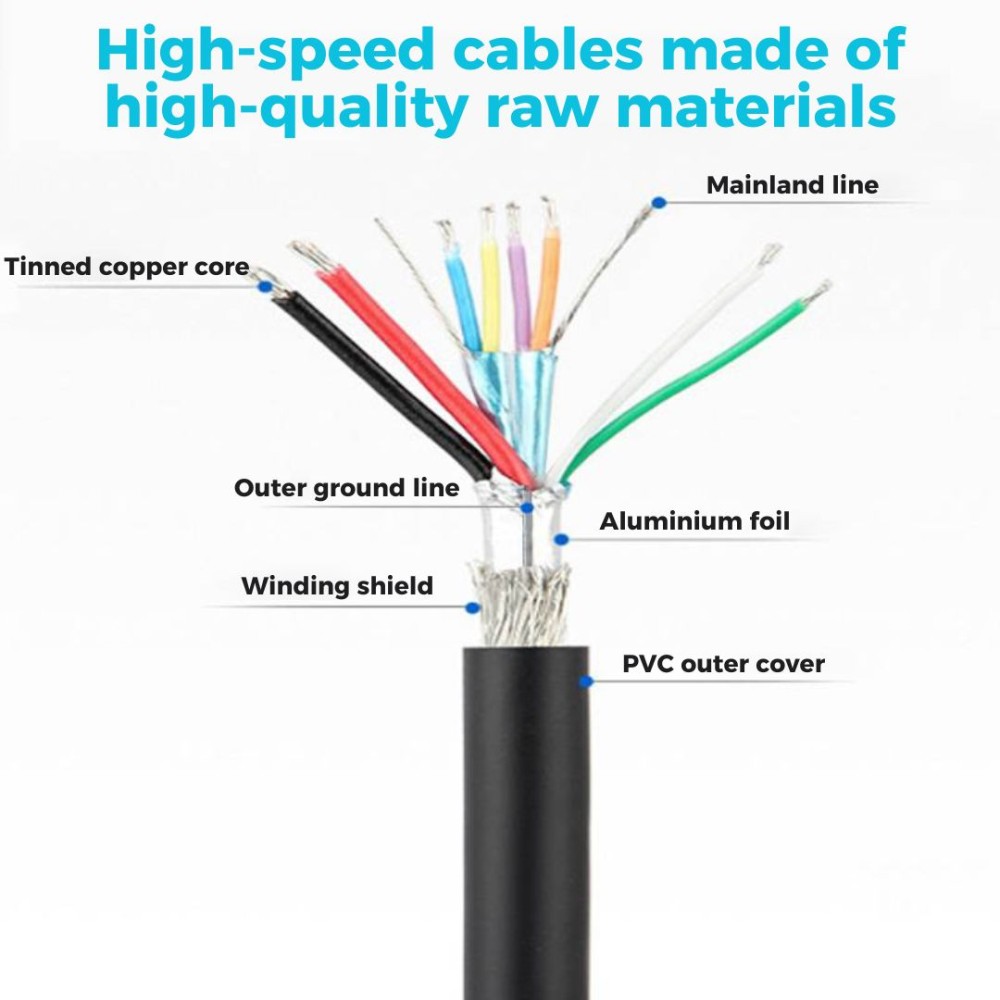 Cablul este construit din materiale premium, incluzand fire interioare din cupru cositorit si protectie ecranata. Invelisul exterior din PVC ofera o protectie suplimentara, asigurand o utilizare indelungata si fiabila.