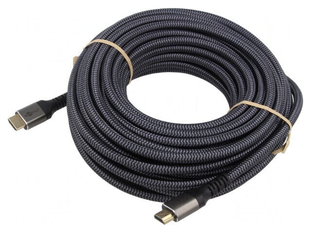 Cablu HDMI 2.0 HDMI mufă, din ambele părţi PVC textilă de la Goobay este un accesoriu esențial pentru a vă bucura de o experiență de vizionare de înaltă calitate. Cu o lungime generoasă de 15m, acest cablu HDMI asigură o conectivitate stabilă și fiabilă între dispozitivele dvs. electronice. Versiunea HDMI 2.0 și High Speed Ethernet vă permit să transferați date rapid și eficient, iar placarea contactelor cu aur garantează o transmisie fără interferențe. Cablul de conectare HDMI - HDMI are o culoare izolație elegantă, în nuanțe de negru și gri, și este echipat cu o structură de ecran din folie de aluminiu și o tresă din sârme de aluminiu pentru protecție suplimentară împotriva interferențelor. Cu caracteristici precum firele cu structură cablu/adaptor din ambele părți și mufa HDMI integrată, acest cablu este durabil și ușor de instalat. Materialele izolante din PVC și diametrul exterior de 6,5mm asigură flexibilitate și rezistență sporită. Cablul este triplu ecranat și poate funcționa cu rezoluții 4K și UHD 2160p, oferindu-vă o experiență de vizionare clară și detaliată. Înfășurat într-un material textil de calitate și protejat de o carcasă de aluminiu, acest cablu HDMI este proiectat pentru performanțe superioare și durabilitate pe termen lung.