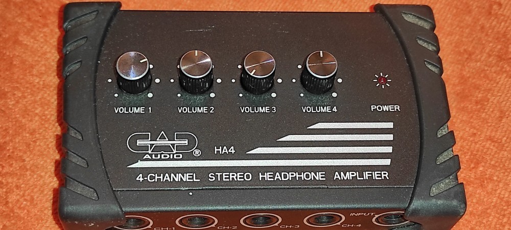CAD HA4 este un amplificator stereo compact pentru căști, cu patru canale și controale individuale de volum.
