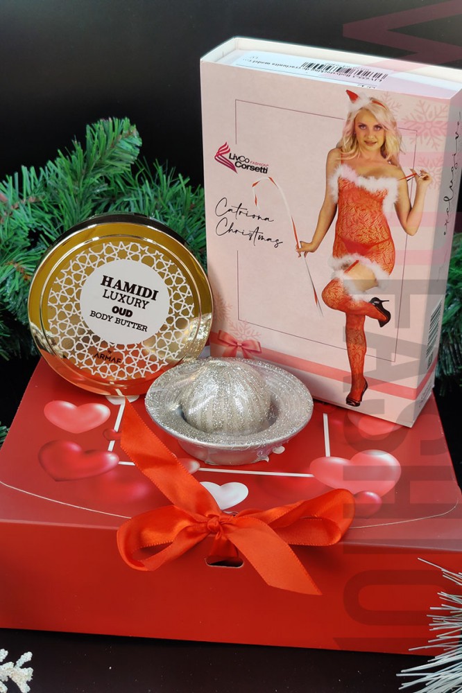 Cadoul contine: 1) Bodystocking de craciunita model cu jartiere, din material supraelastic si bretele elastice peste umeri, accesorizat cu puf alb Produs masurat si verificat - bodystocking de craciunita - model cu jartiere - din material elastic - bretele elastice peste umeri - accesorizat cu puf alb - se potriveste pentru marimi intre S - L - material: 90%poliamida, 10%elastan Producator: Livia Corsetti - EU 2) Oud Body Butter (unt de de corp) are o aromă bogată și luxuriantă de oud ce îţi răsfaţă pielea și îţi relaxează simţurile la fiecare utilizare… și mult timp după aceea. Sex: Unisex Origine: Emiratele Arabe Unite